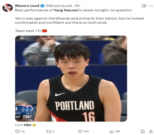 赛后开拓者球迷、开拓者媒体、美国媒体都为杨瀚森此役的表现点赞:克林根与萨尔发生了一次冲突导致球队的胜利溜走,而杨瀚森在场+11明显更出色,可斯普利特却不让他在关键时刻参与防守。