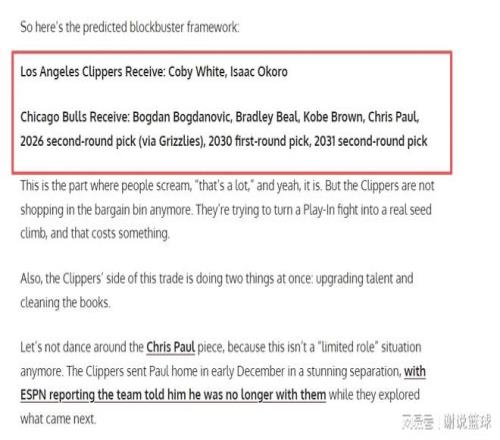 所以美媒结合现状,策划了一笔快船跟公牛的交易,可以换来两名乐透秀,包括科比-怀特和艾萨克-奥科罗。而快船在交易方案里,送走四人包括博格丹、比尔、科比-布朗以及即将退役的保罗,再加上未来首轮签,它来自于2030年,至于两个次轮签,因为自身价值相对较低,就算纯粹的添头了。