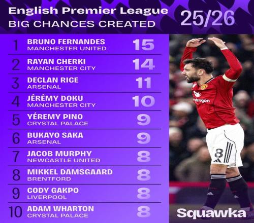 英超23轮过后,布鲁诺-费尔南德斯以10次助攻领跑英超助攻榜,据数据机构Squawka统计,这位红魔队长也是本赛季英超创造绝佳机会最多的球员。
